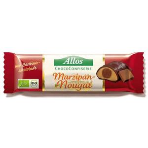 Chokolade, marcipan & nougat bar Ø (Allos)Økologisk bar overtrukken med mørk chokolade med delikat marcipanfyld og hasselnød-nougat kerne. (Læs mere)