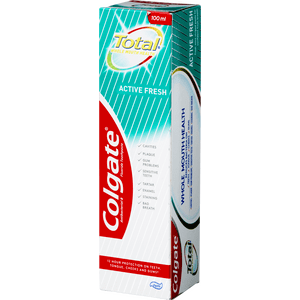 Colgate Total Active Fresh Tandpasta giver god ånde og en sund mund Colgate har udviklet denne tandpasta, som aktivt bekæmper dårlig ånde, for at du kan føle dig frisk hele dagen.Tandpastaens formel går ind og fjerner bakterier fra både tænder, tunge og t (Læs mere)